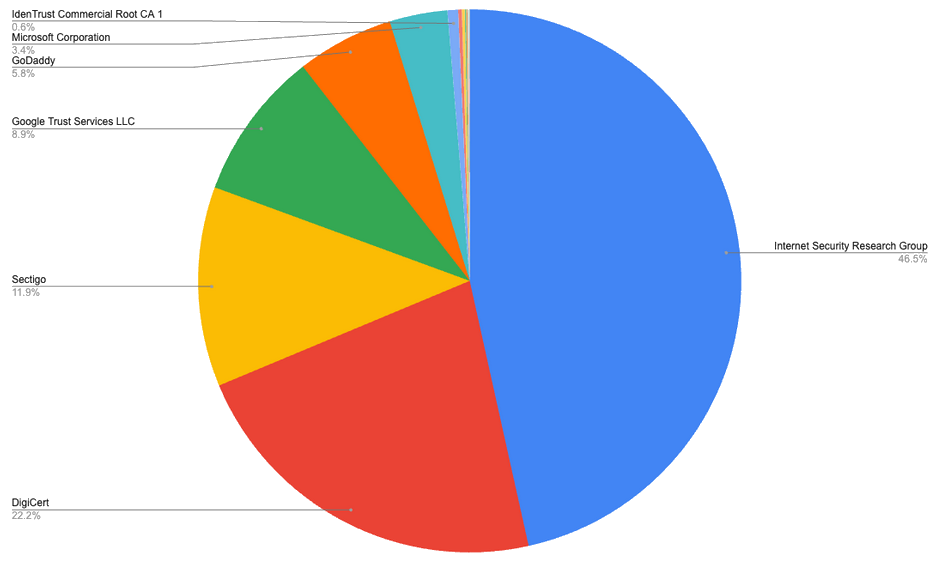 On Security Now! podcast #951, Steve told us that 7 organizations in the PKI are responsible for minting upwards of 99% of all existing certificates. (Possible original source.)